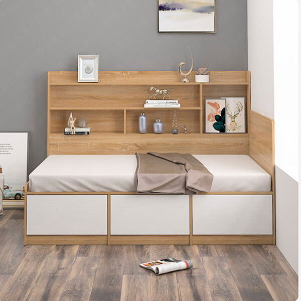 Những ngăn kéo lớn và rộng rãi để bạn có thể cất chăn màn, quần áo,…Phần kệ sách có thể để sách để tiện lấy ra và cất đi, rất phù hợp cho những ai có thói quen thường xuyên đọc sách trước khi khi ngủ.
