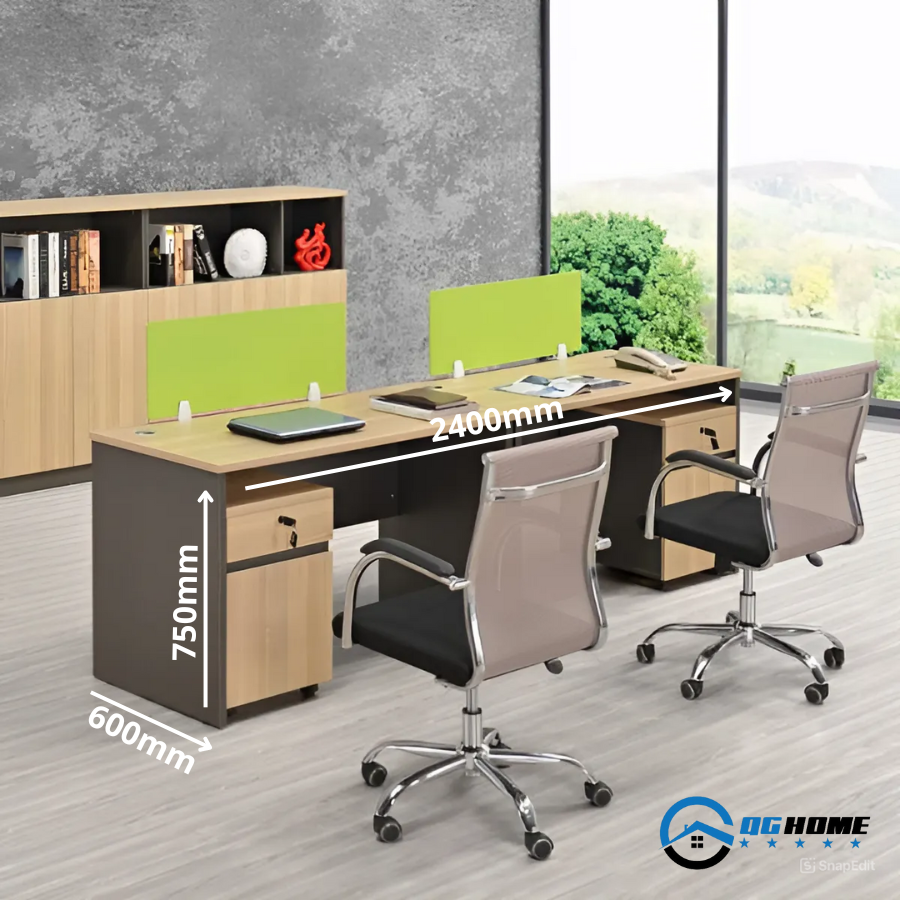 - Bàn: Dài 2400mm x Rộng 600mm x Cao 750mm.