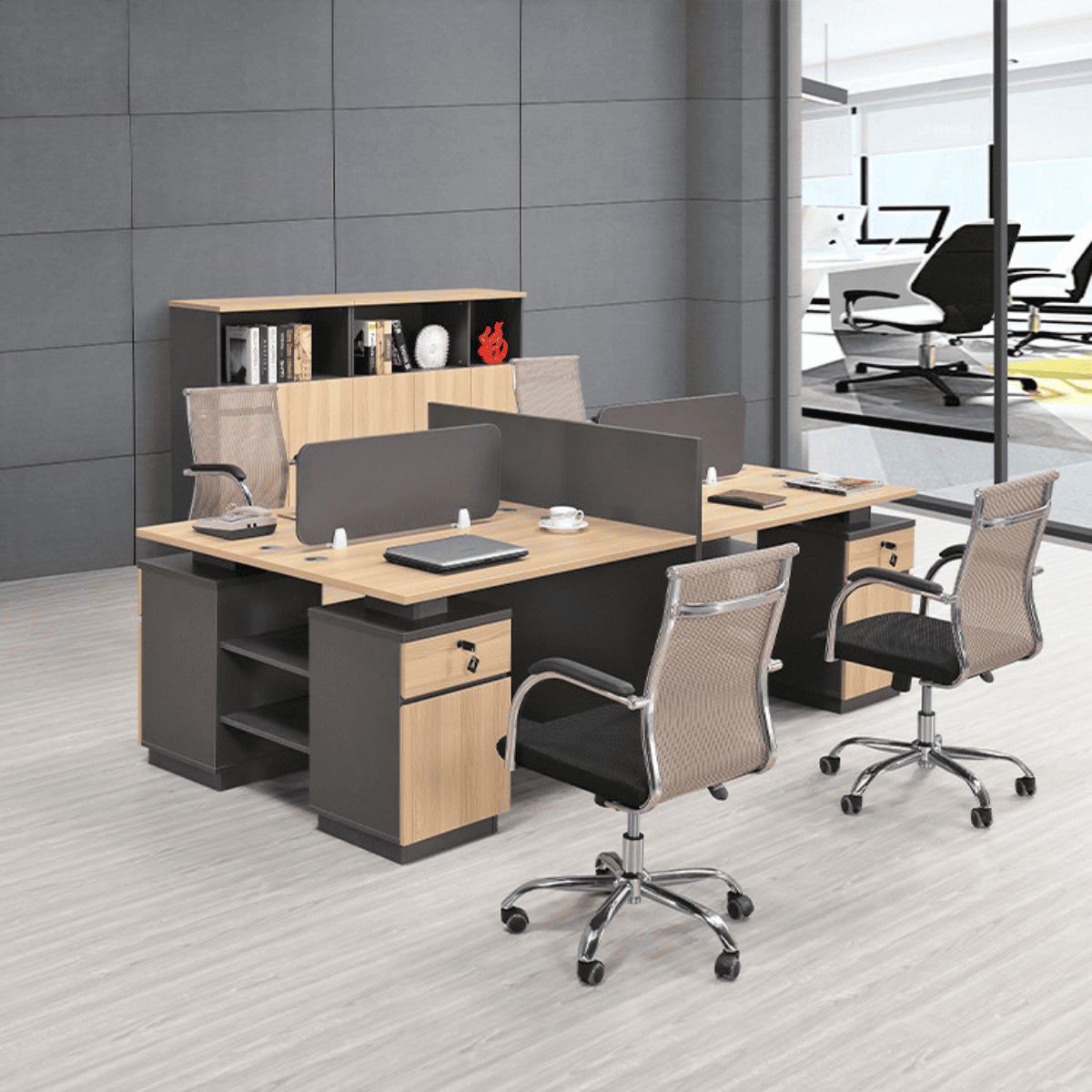 Màu sắc kết hợp giữa gỗ sáng và xám đậm, tạo cảm giác chuyên nghiệp, hiện đại. Vách ngăn cao thiết kế có thêm ngăn đựng đồ tối ưu công năng có thể đựng tài liệu hoặc trang trí.