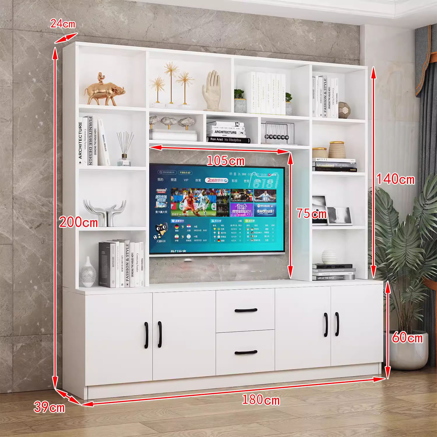 Đối với phần kệ tivi, với kích thước hợp lý thì tivi dù là màn hình lớn hay nhỏ cũng đều có thể thoải mái đặt vào. Mặt khác, nếu bạn sử dụng tivi treo tường thì phần mặt kệ cũng có thể dùng để đặt đồ trang trí lên đó.