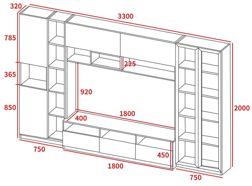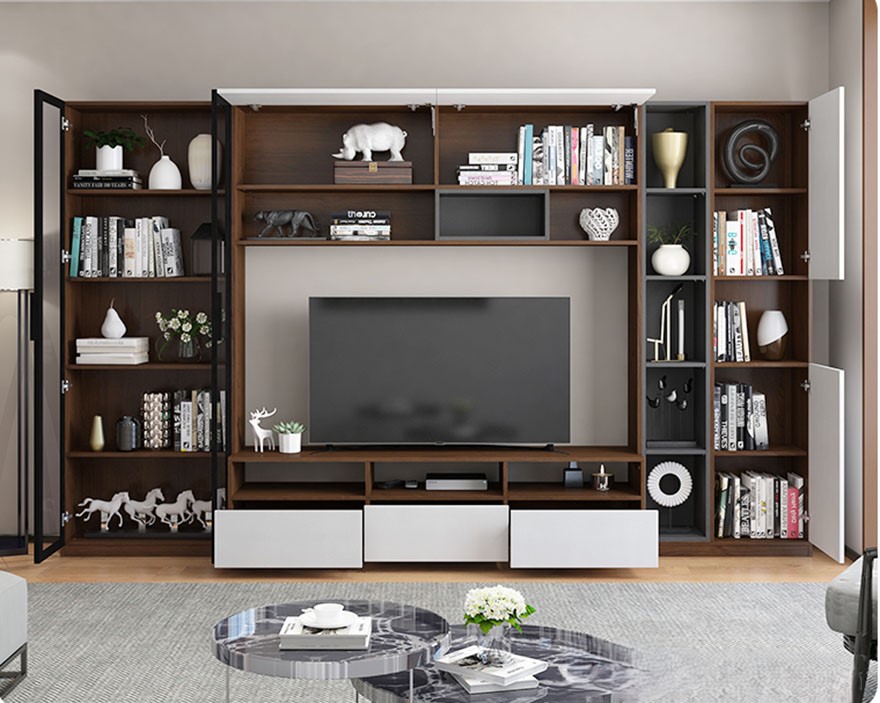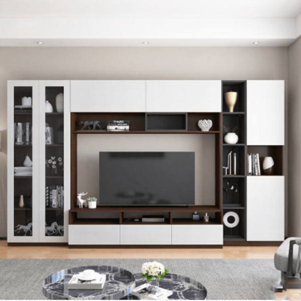 Bộ tủ tivi này bao gồm 01 kệ tivi, 02 tủ phụ lớn ở bên gắn cùng 01 tủ treo. Toàn bộ các phần tủ kệ này được lắp ghép lại với nhau để tạo nên kết cấu tủ hình chữ nhật khép kín rất độc đáo và phong cách.